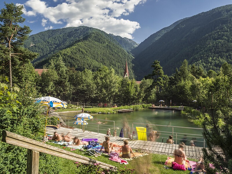 Eingebettet in einer herrlichen Landschaft entstand ein traumhafter „Naturbadeteich“ mit über 800 qm Wasseroberfläche und einer tollen Wasserrutsche (41 m lang) mit Regenerations- und Kinderbecken. Die auf rein biologische Selbstreinigung aufgebaute Wasserwelt ist einzigartig in Südtirol und ein Garant für gesundes Baden. Großzügige Liegewiesen und kleine ruhige Plätzchen laden ein zum verweilen und sich erholen.Öffnungszeiten: von Anfang Juni bis Anfang September täglich von 9.30 bis 20.00 Uhr