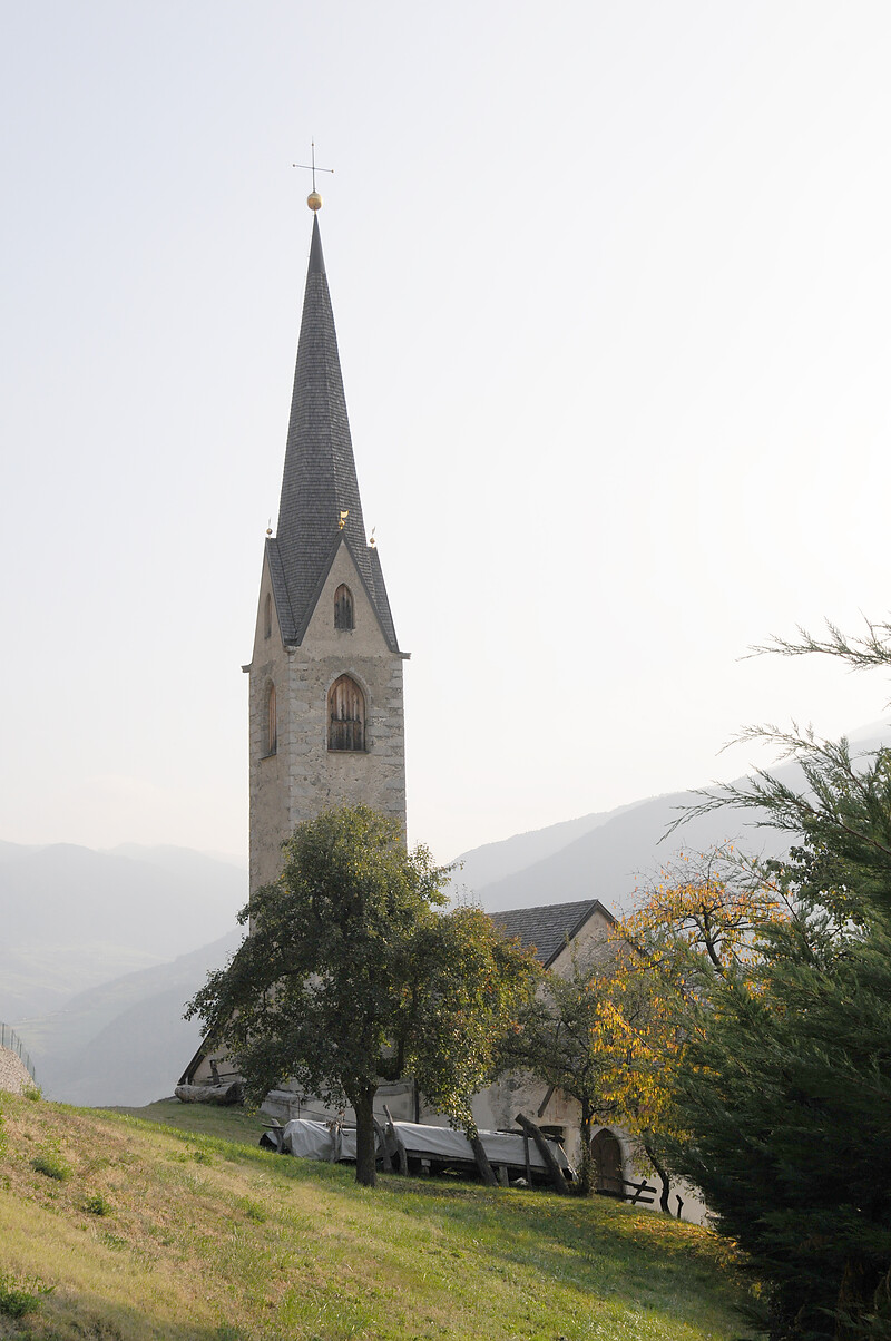 On the road from Klausen to Villanders stands the church dedicated to St. Valentine. St. Valentine’s Church is a single-nave building with a straight-ended chancel and a pointed side spire. The church is first mentioned in 1303; it burned down around 1400 and, during its renewal, the former flat ceiling was replaced by the present, very beautiful Gothic star vault. The altar inside is a fine Neo-Gothic woodcarving and, on either side of the “Gottesmauer,” shows the two St Valentines: the bishop and, to Mary’s left, the priest saint. Particularly valuable works of art are the frescoes on the west façade depicting the Crucifixion group and St Anne with Mary and the Christ Child. They are delicate figures with soft, rounded drapery folds. Patterned halos and picture frames with geometric ornament identify these images as outstanding works of the so-called “beautiful, soft style,” which also reached Tyrol around 1400.