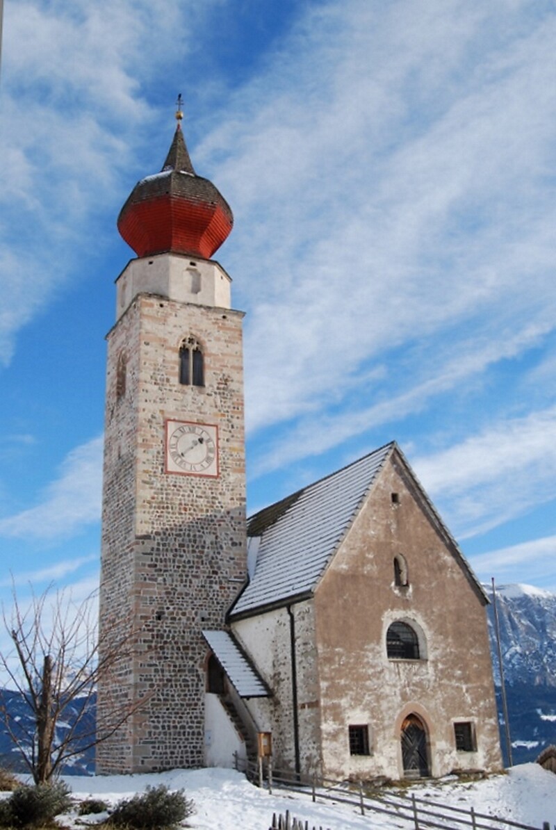 The St. Nicholas church in Mittelberg is first mentioned in 1289. This church was enlarged in the Gothic style in 1400 and has kept its appearance from that time. The tower is somewhat later than the church and was probably built in the 14th Century. It is made of natural stones laid in regular patterns. Possibly in 1400 the upper levels were altered to the Gothic tyle and the existing windows date from that period. In 1744 a rather large onion dome was added. It does not fit the building but is still quite pleasing. Another reason for building the church was the competition between the summer visitors to Klobenstein and those of Maria Himmelfahft. In Klobenstein they did not wish to be behind the people who were building their own church in Himmelfahrt at the time.