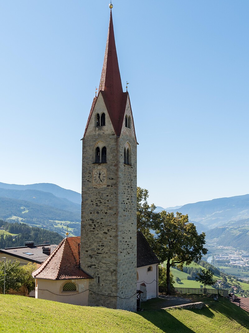 La chiesa di S. Leonardo sprigiona un vigore popolare. Fa riferimento al santo patrono del bestiame e dei carcerati la pesante catena che attornia per una volta e mezza l’intero edificio sacro. Consacrata nel 1194 e ristrutturata nel 1430, la chiesa subì un rifacimento barocco nel XVIII secolo. Al barocco ed alla creatività del capomastro Tangl fanno riferimento i preziosi stucchi del soffitto, opera della bottega di Franz Singer (1770c.). Gli affreschi realizzati da Toni Kirchmair sono un richiamo alla storia recente: creati attorno al 1920, essi presentano S. Leonardo come patrono dei prigionieri e dei caduti durante la prima guerra mondiale.